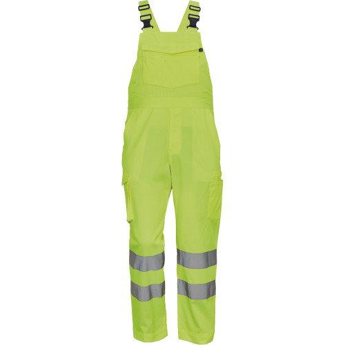 férfi Hi-Vis mellesnadrág 7 cm széles fényvisszavető csíkokkal; rugalmas betét a hátsó részen; 2 oldalsó zseb + 1 érmezseb; 2 oldalzseb; 1 multifunkcionális mellzseb; rugalmas pántok műanyag csatokkal; meghosszabbítható szárhossz