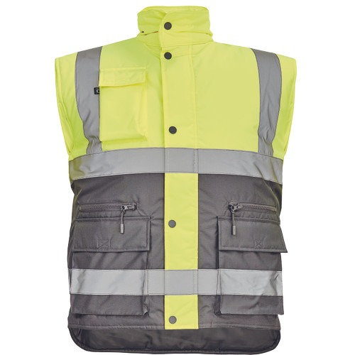 Hi-Vis bélelt férfi mellény, gallérba rejthető kapucnival; 5 cm széles fényvisszavető csíkok; cipzáras, patentos hajtókával; telefonzseb; 2 nagy első zseb hajtókával, és két cipzáras zseb