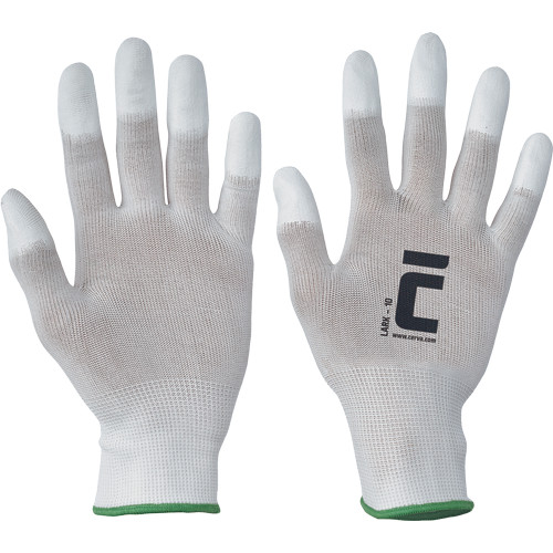 Kötött, varratmentes nylon kesztyű vékony poliuretán bevonatú ujjhegyekkel és rugalmas mandzsettával.