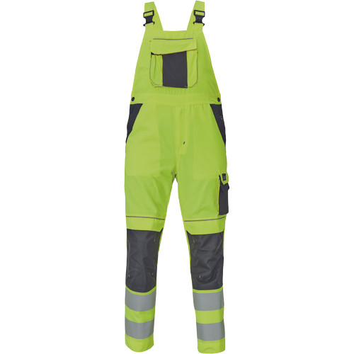 Férfi HI-VIS mellesnadrág rugalmas derékkal, széles pántokkal, műanyag csatokkal; 2 első zseb, 1 oldalzseb, 1 nagy mellzseb, 2 hátsó zseb; 2 kis hátsó zseb a jobb combon; nyomtatott 7,5 cm-es fényvisszavető csík a szárak alján; fényvisszavető szegés; Oxford 600D megerősített térdrész, térdpárna tartó; meghosszabbítható szárak