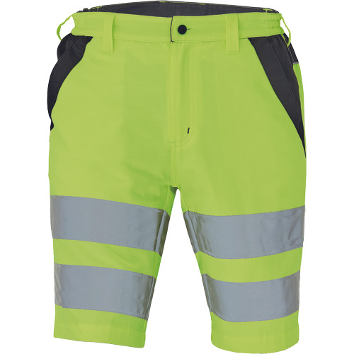 férfi HI-VIS rövidnadrág rugalmas derékkal; 2 első zseb, 2 hátsó zseb; két 7 cm-es nyomtatott fényvisszavető csík a comb körül; fényvisszavető szegés