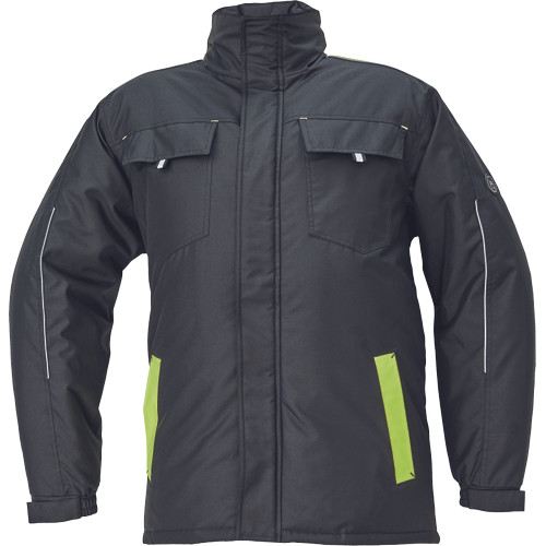 férfi téli kabát; tépőzáras takarópánttal fedett cipzár; 2 oldalsó zseb, 2 mellzseb; 1 belső mobiltelefonzseb; rugalmas mandzsetta tépőzárral; fényvisszavető szegés