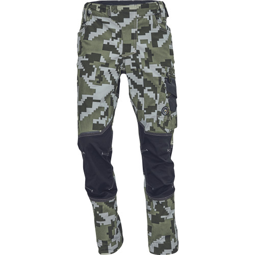 férfi munkanadrág innovatív, rugalmas TRIFIBETEX anyagból, CORDURA betétekkel digitális terepmintával, elöl 2 ékzseb, hátul 2 tépőzáras foltzseb, bal oldalt nagy multifunkciós zseb, jobb oldalt multifunkciós vonalzó, kés és ceruzatartó, fém "D" gyűrű, rugalmas derék, hosszabbítható szárhossz, fényvisszavető elemek, dekoratív tripla varrás kontrasztos színnel, kalapácstartó