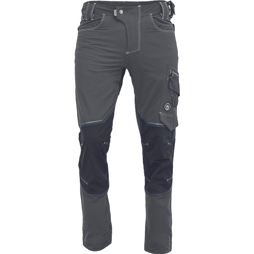 férfi munkanadrág innovatív, rugalmas TRIFIBETEX PRO anyagból, elöl 2 ékzseb, hátul 2 tépőzáras foltzseb, bal oldalt nagy multifunkciós zseb, jobb oldalt multifunkciós vonalzó, kés és ceruzatartó, fém "D" gyűrű, rugalmas derék, hosszabbítható szárhossz, fényvisszavető elemek, dekoratív tripla varrás kontrasztos színnel, kalapácstartó