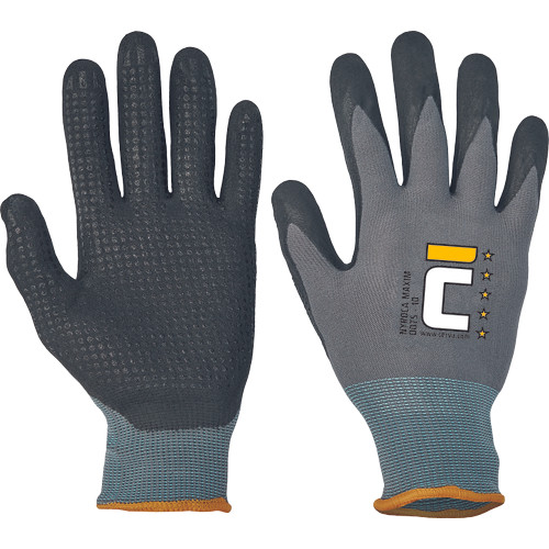 Védőkesztyű, nylon/lycra dzsörzé, mikroporózus nitril mártással. Nitril pontozás a tenyéren és ujjakon is. Kiváló folyadékállóság, jól tapad minden helyzetben: száraz, vizes és olajos környezetben is.