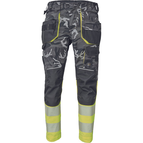 Férfi jólláthatósági nadrág rugalmas derékkal és többfunkciós zsebekkel, fényvisszavető elemekkel és 7 cm-es szegmentált fényvisszavető csíkokkal. Megerősített térdrész és térdzseb Oxford 600D anyagból térdvédő behelyezéséhez. Ellenálló hármas fedőző varrás az üleprészen és a meghosszabítható szárakon. Modern terepmintával.