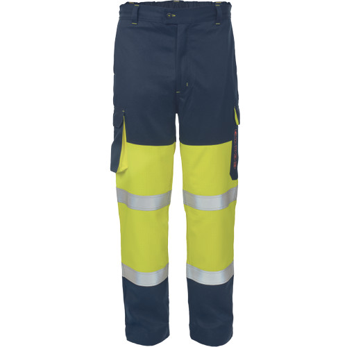 HI-VIS multinorm nadrág rugalmas derékkal, 5 cm-rel meghosszabbítható szárakkal. Praktikus kialakítás 2 oldalzsebbel; a combokon 2 hajtókás zsebbel; 2 tépőzáras hátsó zsebbel. A nadrág a szárakon egy pár 5 cm-es varrott fényvisszavető csíkkal van ellátva.