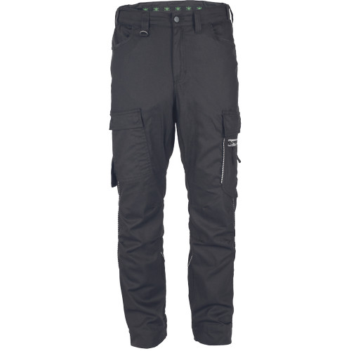Modern szabású munkanadrág formázott oldalvarrásokkal, rugalmas derékpánt, megerősített térdrész, rugalmas betétek hátul és az üleprészen, 2 D-gyűrű (nikkelmentes) a derékpánton, 2 első zsebbel, 2 zsebfedős oldalzsebbel, a bal száron cipzáras zsebbel (reflex cipzár), többfunkciós zsebek szerszámoknak, 2 farzseb, jobb oldalon zsebfedős, tépőzáras záródással, fényvisszavető részletekkel.
